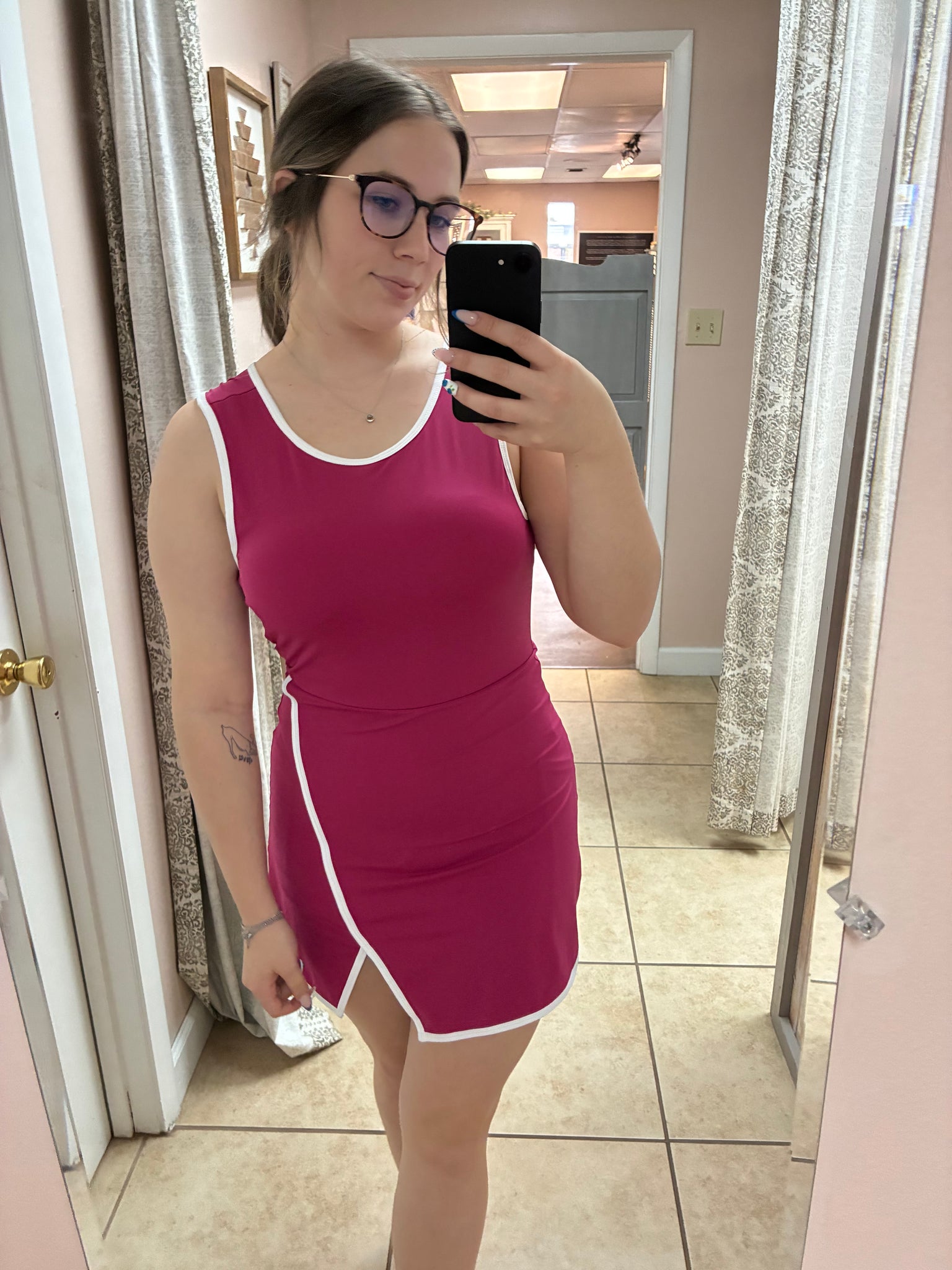 The athletic dress to have! Fully lined, shorts and it has a built in padded bra.
